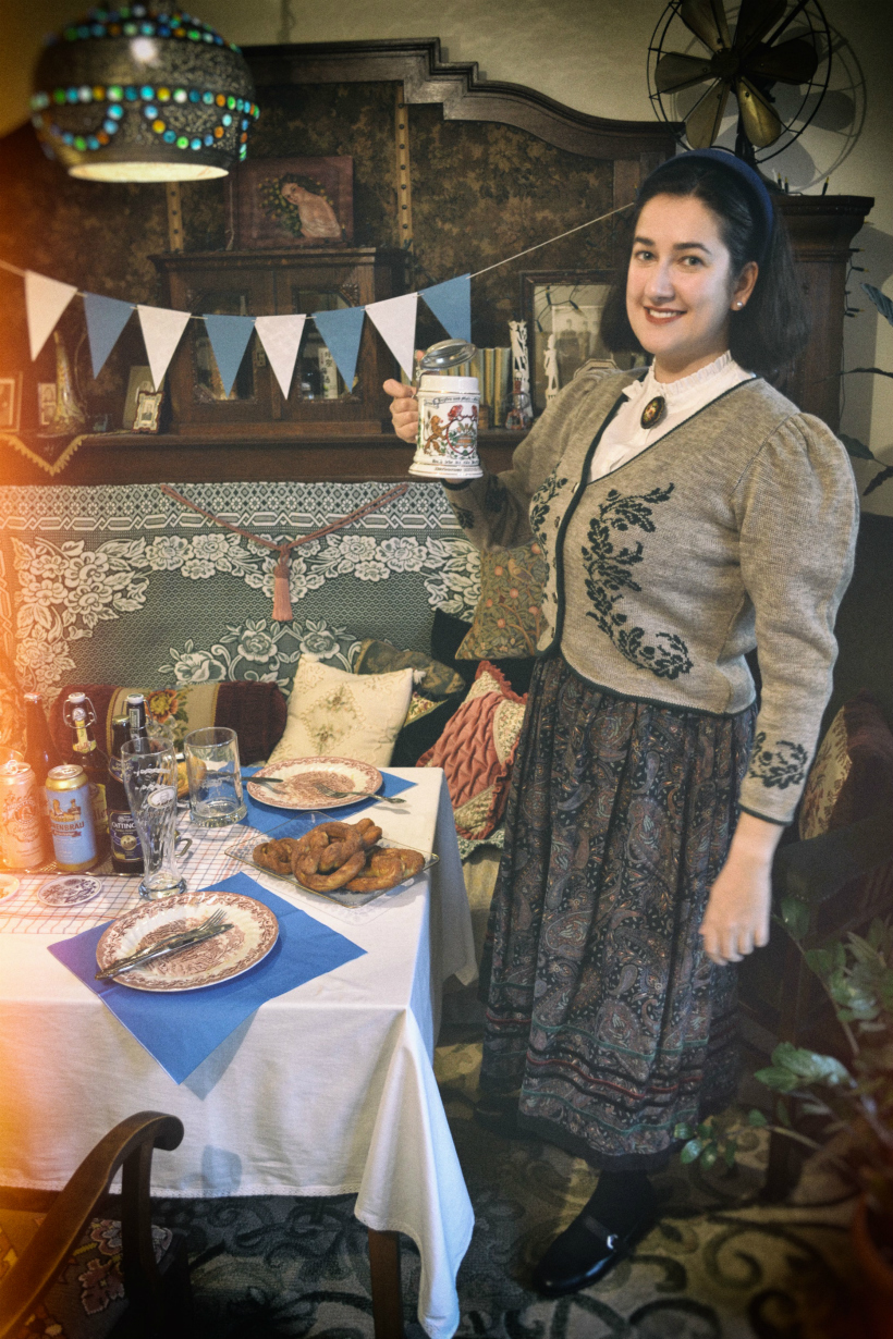 Sweter pochodzi z kolekcji vintage bawarskiej firmy Astrifa. Jest wykonany w 100% z wełny merynosów i zapinany na guziki z jelenich rogów. Firma do dziś szyje regionalne inspirowane tradycją swetry i żakiety, które można kupić m.in. TUTAJ. Niektóre chętnie zaprosiłabym do swojej szafy. Swój egzemplarz wyhaczyłam w ciucholandzie i zapłaciłam za niego 18 złotych.